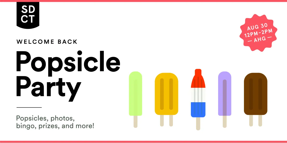 SDCT welcomes you back to campus with a party like no other! Students, faculty, and staff are invited to visit AHG for some food and fun. Enjoy refreshing popsicles, play bingo to win prizes, and get your hands on some new SDCT swag.