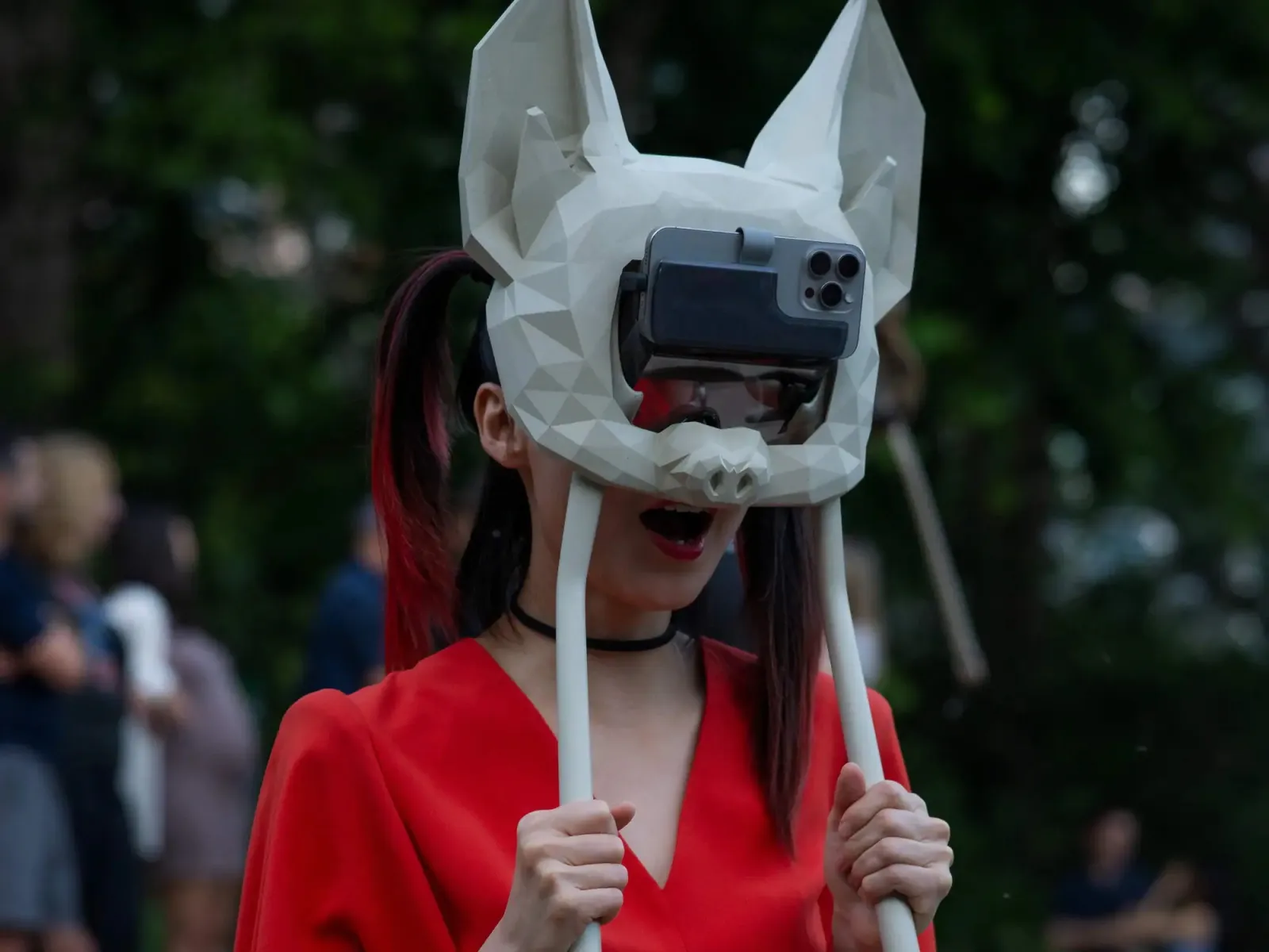 A person wearing a futuristic, geometric bat mask with a smartphone attached to the front, acting as a digital visor. The mask is white with angular facets, covering the entire head. The person, dressed in a striking red outfit, holds two white rods extending from the mask. Their mouth is open in an expressive pose. The background is blurred with an outdoor setting and a crowd of people, suggesting a live event or performance.